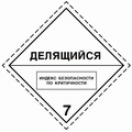 Символ (трилистник) — черный. Фон — верхняя половина желтая с белой каймой. Нижняя — белая. Текст (обязательный) — черный в нижней половине знака. «Радиоактивно» «Содержимое...» «Активность...». В черном прямоугольнике: «Транспортный индекс». За словом «Радиоактивно» должны следовать две красные вертикальные полосы. Цифра «7» в нижнем углу.
